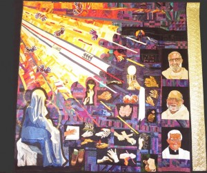 • 3 Priests on right side of quilt: Bottom is Fr. Don Burns, founder of Mary Mother of the Church. Above him is Fr. Jim Zappa, retired in 2014 and served 25 years. Above Fr. Jim Zappa is Fr. Jim Perkl, 2014 to present. All three faces were created by fusing batiks onto a background, then stitching the edges of each piece.